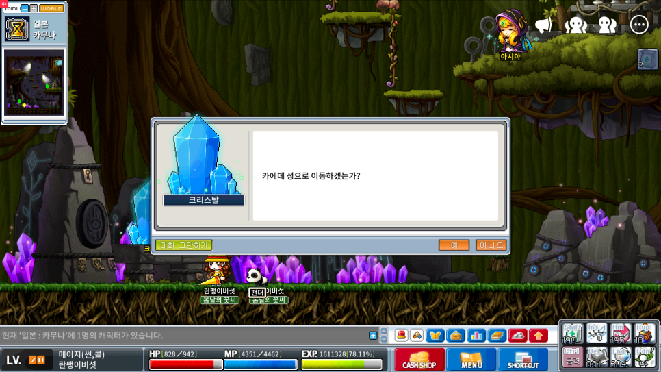 핵심은 우물입니다. 버섯신사에서 우물로 입장한 뒤, 나무 포털로 이동하고, 마지막에 크리스탈과 대화하면 됩니다.