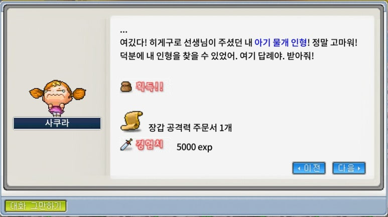 아기 물개 인형 200개를 모두 모았다면 사쿠라에게 돌아가 완료 보고를 합니다. 완료 대화(스크립트)에서 보상 안내가 나오며, 이후 퀘스트가 종료됩니다.